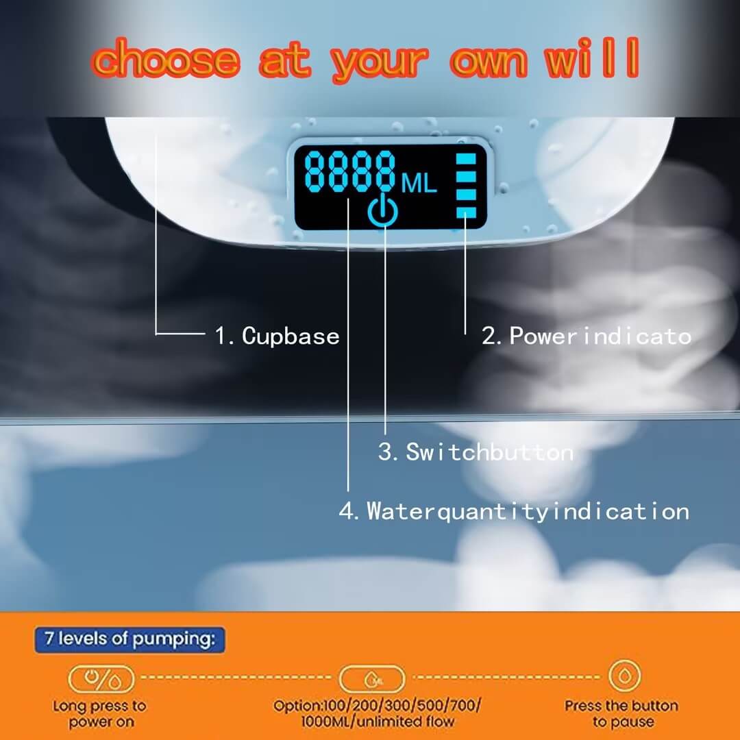 1. 【Smart】Smart with 8 levels of quantitative pumping, 8-stage capacity selection with indicator light (100ml, 200ml, 300ml, 500ml, 700ml, 1000ml, and unlimited flow), the electric water dispenser is suitable for various types of bottles (1~5 gallon).